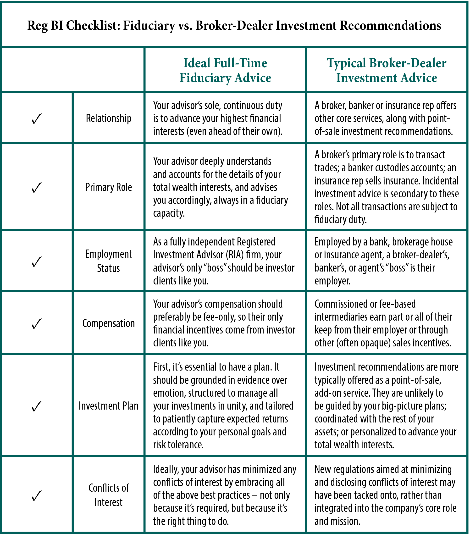 - More due diligence: You, the investor, must still sort out which side of the table an investment recommendation is coming from. Worse, the well-established terminology that used to help you distinguish fully fiduciary from merely suitable advice has been subsumed under the fuzzier, untested language of Reg BI.